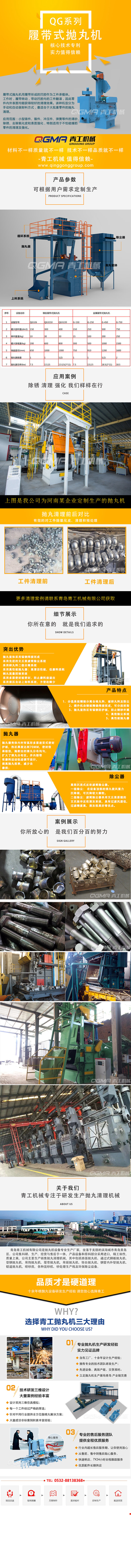 几乎所有的铸钢件、灰铸件、 玛钢件、球铁件等都要进行抛丸处理。这不仅是为了清除铸件表面氧化皮和粘砂,同时也是铸件质量检查前不可缺少的准备工序, 比如大型气轮机机壳在进行无损探伤以前必须进行严格的抛喷丸清理,以保证探伤结果的可靠性。在一般铸件生产中,抛喷丸清理是发现铸件表面缺陷如皮下气孔、渣孔以及粘砂、冷隔、起皮等的必不可少的工艺手段。有色金属铸件,如铝合金、铜合金等的表面清理,除清除氧化皮、发现铸件的表面缺陷外,更主要的目的是以抛喷丸来清除压铸件的毛刺和获得具有装潢意义的表面质量,获得综合效果。冶金钢铁生产中,抛喷丸或者酸洗是保证钢铁大量生产中获得高生产率而采用的机械或化学联合去除磷皮的一种工艺方法。硅钢片、不锈钢薄板等其他合金钢板、带的生产中,在冷轧工序过程中必须进行退火后再进行抛丸或酸洗处理,以保证冷轧钢板的表面粗糙度及厚度精度。