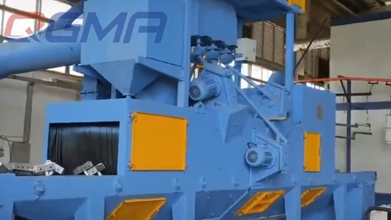 ③铝模板翻新用抛丸机需要的人工少;两个人就可以操作机台,一个上模板,一个小模板,机械抛丸后自动吹干净表面的钢丸{钢砂}磨料耗材重复利用起来,不浪费,节约成本,提供产能。