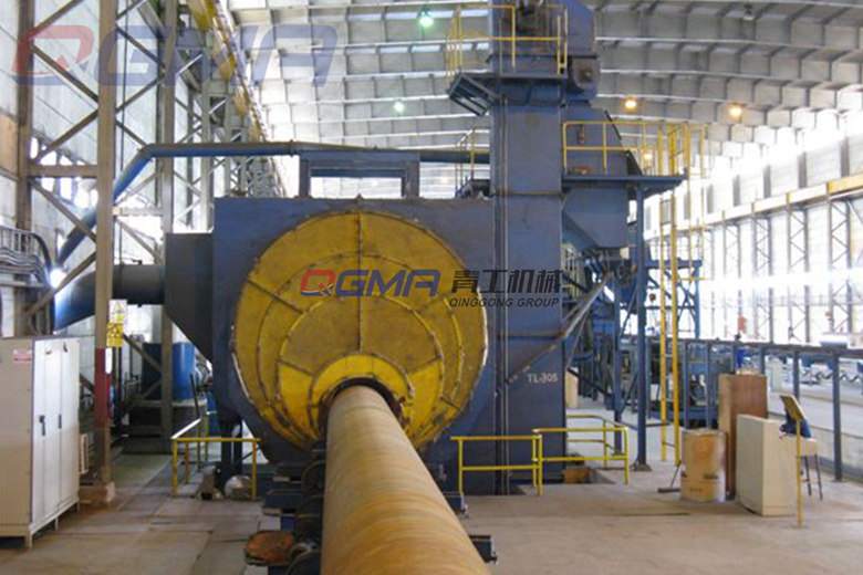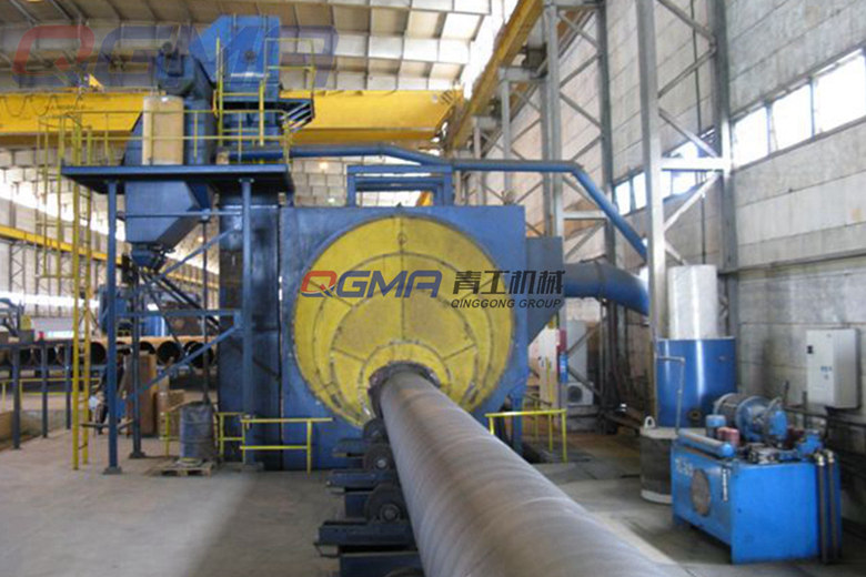 无缝管辊道,能够多角度,全方位,高密集的清理表面;能够使钢管表面的锈蚀层,焊渣,污物和氧化皮等物迅速脱落;能够增加钢管表面的粗糙度,能够提高油漆在表面的附着力;能够提高钢管的抗腐蚀和抗疲劳的能力,改善工件的质量,延长使用寿命;使用了钢管的自动上料和下料技术,降低了工人老大强度.提高生产效率。该设备包括机体以及设置在所述机体上的输送机构、吸尘机构、钢管内壁抛丸机构和钢管外壁抛丸结构,由输送机构和输送小车带动无缝钢管在左、右设备箱之间转动移动,移动的同时,钢管被同时加工,另外由于无缝钢管的转动方向与抛丸抛出的方向相反,还可有效提高抛光效果。