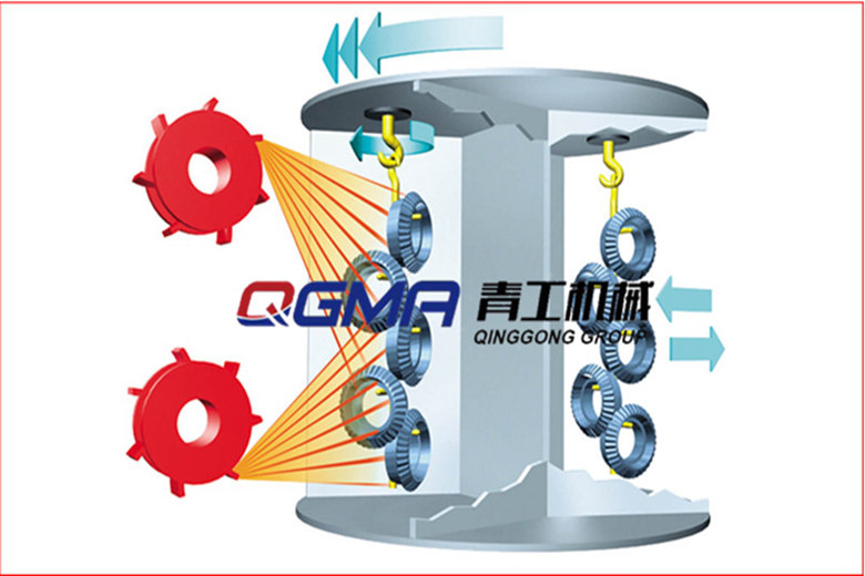 曲轴吊钩式抛丸机适用于齿轮、齿轴、锻造、铸造、建筑、化工、电机、机床等行业的中、小型铸、锻件的表面清理或强化处理,如除氧化皮、毛刺、砂铸件除砂等。曲轴吊钩式抛丸机由两个吊钩装载工件交替进入抛丸清理室内。利用抛丸器将0.1~1.5mm的弹丸抛向工件的表面,使得工件的表面达到一定的粗糙度,让工件变得美观,或者改变工件的压应力提高寿命。轨道一般分为I型、Y型,1-2个高负载吊钩由手动或自动系统控制进入抛丸室进行清理,在多个高效抛丸机和吊钩自转的配合下,可以清理复杂工件的各个表面。曲轴吊钩式抛丸机采用框架结构机身+全锰钢护板,使用寿命5-10年;采用先进的文丘里除尘系统;采用碎丸料二级分离系统;采用高性能抛丸器:高清洁性能,低磨料损耗;钢丸流量自动控制系统;主机顶部采用3层密封结构,无任何丸料泄露;青 工曲轴吊钩式抛丸机作业时,抛丸器抛射出来的钢丸掉落到抛丸室底部,由螺旋推料器输送至提升机底部,再由提升机皮带总成将钢丸提升至顶部的分选器中,对回收的钢丸进行筛分作业。目的是将抛丸过程中破碎的钢丸及粉尘分离出来。通过分选器,合格的钢丸将直接进入抛丸器上方的储料仓内,准备再次利用。碎钢丸将被分离出来,通过旁路砂管掉入废料筒中;粉尘则被吸入除尘器内,在正常操作下,含尘的空气进入除尘器,然后向下经导流板分散后通过滤芯,粉尘即被阻挡在滤芯外表面上,过滤后的清洁空气经滤芯中心进入清洁空气室,通过出口排出。曲轴吊钩式抛丸机作为抛丸清理机的标准机型,其抛丸室旋转直径从1000到3000 mm, 高度从1200 到3000 mm. 标准机型带有2-7个抛头,承载量达10000公斤,这款抛丸机的生产效率相当高,灵活性跨度也相当大,是理想的清理强化设备,并且操作简便,只需将要处理的工件装载上机器,按下启动按钮,经过一个很短的时间(一般为5-7分钟),即完成了整个清理过程,清除掉所有粉尘和残余丸料,主要适用于各种中、大型铸件、锻件、焊件、热处理件的表面处理,包括易碎和形状不规则的工件。曲轴吊钩式抛丸机的抛丸器高性能抛丸器:高清洁性能,低磨料损耗;抛丸器壳体内衬有弧形多层迷宫式密封护板,热区厚度达到70mm,密封效果极佳,抛射出的弹丸分布均匀,扩大了弹丸分布区。并内部带有磨料运动轨迹调节设计,提高抛丸效率,减少自磨损;国内其他厂家的抛丸器为平腔式分丸结构在弹丸进入时,会形成涡流,约20%的弹丸不会被射出,利用率仅为80%。我公司KT系列抛丸器特有的涡轮式分丸结构,使弹丸进入抛丸器内进入分丸轮不会形成涡流,弹丸利用率提高至99%。提高效率30%。电机是国内知名品牌或西门子(可选);叶轮采用40CrMnMo材料渗碳淬火,叶片及防护板选用高铬特种耐磨铸铁制成,热处理后表面硬度HRC60-65,有高效的耐磨性及使用寿命;所有高速旋转的叶片通过天平秤重配对,保证叶片之间重量差小于3克,以保证平衡。流量阀半自动流量控制系统,用于控制进入抛丸器的丸料流量,通过手动调节钢丸流量; 全密封的结构设计,带可锁定的检查开口,配有二个轴承;每个流量阀门上端,各装有一个手动截止阀,如果需要维修流量阀时,可以关闭,用以关闭从料仓流下的丸料,方便维护。抛丸室体及抛丸器均通过3D及动态仿真设计,抛丸器抛射方向与钢材(工件)行进方向成合适角度,以产生最佳冲击效果,并防止弹丸空抛,影响清理效果,做大限度发挥设备效能。清理室主抛射区采用360°高强度锰钢护板防护,此护板具有很高的冲击韧性及较高的使用寿命(正常使用10年),能充分利用弹丸的反射动能,继续有效地击打被清理工件表面,利于提高清理质量及清理效率。顶部上的吊钩轨道处装有三层密封板,保证吊钩运转顺畅的同时可防止磨料溢出,保证安全、降低噪音。Y型导轨车,实现两工位连续作业。换轨机构气动阀控制,实现换轨功能。一个吊具处于抛丸工作状态时,另外一个用于装卸。工装系统,耐磨钢棒热处理后焊接制成(可根据客户实际需求设计)。吊具系统采用电动葫芦系统,稳定性好。电控箱采用西门子PLC和触摸屏;采用台达或者欧姆龙变频器;采用正泰或者施耐德品牌低压电气元件;采用抛丸时间控制器;采用亚德客气动元件;采用流量检测电流表。公司环保事业部系列高效沉流式反吹滤筒除尘器是吸收国外先进技术设计制造的新一代高效除尘器,主要用于喷砂,抛丸设备及车间等环保除尘,一级除尘为设计在设备顶部的弹丸旋风重力沉降室。该沉降室为符合空气动力学原理的惯性沉降室,它既能够实现弹丸的有效沉降,又不会产生压力损失。可沉降较大颗粒,提高过滤材料的使用寿命。二级除尘为经久考验的经济适用的滤筒除尘器,滤筒除尘器采用文丘里原理的文氏管脉冲反吹清灰系统,具有过滤风速低,过滤精度高,清灰效果好等优点。在正常操作下,含尘的空气进入除尘器,然后向下经导流板分散后通过滤芯,粉尘即被阻挡在滤芯外表面上,过滤后的清洁空气经滤芯中心进入清洁空气室,通过出口排出。