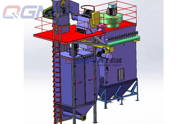 车架吊钩式抛丸机分为单吊钩和双吊钩,吊钩式抛丸机由两个吊钩装载工件交替进入抛丸清理室内。利用抛丸器将0.1~1.5mm的弹丸抛向工件的表面,使得工件的表面达到一定的粗糙度,让工件变得美观,或者改变工件的压应力提高寿命。轨道一般分为I型、Y型,1-2个高负载吊钩由手动或自动系统控制进入抛丸室进行清理,在多个高效抛丸机和吊钩自转的配合下,可以清理复杂工件的各个表面。车架吊钩式抛丸机适用于齿轮、齿轴、锻造、铸造、建筑、化工、电机、机床等行业的中、小型铸、锻件的表面清理或强化处理,如除氧化皮、毛刺、砂铸件除砂等。车架吊钩式抛丸机采用框架结构机身+全锰钢护板,使用寿命5-10年;采用先进的文丘里除尘系统;采用碎丸料二级分离系统;采用高性能抛丸器:高清洁性能,低磨料损耗;钢丸流量自动控制系统;主机顶部采用3层密封结构,无任何丸料泄露;青 工机械车架吊钩式抛丸机作业时,抛丸器抛射出来的钢丸掉落到抛丸室底部,由螺旋推料器输送至提升机底部,再由提升机皮带总成将钢丸提升至顶部的分选器中,对回收的钢丸进行筛分作业。目的是将抛丸过程中破碎的钢丸及粉尘分离出来。通过分选器,合格的钢丸将直接进入抛丸器上方的储料仓内,准备再次利用。碎钢丸将被分离出来,通过旁路砂管掉入废料筒中;粉尘则被吸入除尘器内,在正常操作下,含尘的空气进入除尘器,然后向下经导流板分散后通过滤芯,粉尘即被阻挡在滤芯外表面上,过滤后的清洁空气经滤芯中心进入清洁空气室,通过出口排出。吊钩式抛丸机作为抛丸清理机的标准机型,其抛丸室旋转直径从1000到3000 mm, 高度从1200 到3000 mm. 标准机型带有2-7个抛头,承载量达10000公斤,这款抛丸机的生产效率相当高,灵活性跨度也相当大,是理想的清理强化设备,并且操作简便,只需将要处理的工件装载上机器,按下启动按钮,经过一个很短的时间(一般为5-7分钟),即完成了整个清理过程,清除掉所有粉尘和残余丸料,主要适用于各种中、大型铸件、锻件、焊件、热处理件的表面处理,包括易碎和形状不规则的工件。车架吊钩式抛丸机的抛丸器性能高,清洁性能高,低磨料损耗;抛丸器壳体内衬有弧形多层迷宫式密封护板,热区厚度达到70mm,密封效果极佳,抛射出的弹丸分布均匀,扩大了弹丸分布区。并内部带有磨料运动轨迹调节设计,提高抛丸效率,减少自磨损;国内其他厂家的抛丸器为平腔式分丸结构在弹丸进入时,会形成涡流,约20%的弹丸不会被射出,利用率仅为80%。青 工机械KT系列抛丸器特有的涡轮式分丸结构,使弹丸进入抛丸器内进入分丸轮不会形成涡流,弹丸利用率提高至99%。提高效率30%。电机采用国内知名品牌或西门子(可选)叶轮采用40CrMnMo材料渗碳淬火,叶片及防护板选用高铬特种耐磨铸铁制成,热处理后表面硬度HRC60-65,有高效的耐磨性及使用寿命;所有高速旋转的叶片通过天平秤重配对,保证叶片之间重量差小于3克,以保证平衡。半自动流量控制系统,用于控制进入抛丸器的丸料流量,通过手动调节钢丸流量,全密封的结构设计,带可锁定的检查开口,配有二个轴承。每个流量阀门上端,各装有一个手动截止阀,如果需要维修流量阀时,可以关闭,用以关闭从料仓流下的丸料,方便维护。抛丸室体,抛丸室体及抛丸器均通过3D及动态仿真设计,抛丸器抛射方向与钢材(工件)行进方向成合适角度,以产生最佳冲击效果,并防止弹丸空抛,影响清理效果,做大限度发挥设备效能。清理室主抛射区采用360°高强度锰钢护板防护,此护板具有很高的冲击韧性及较高的使用寿命(正常使用10年),能充分利用弹丸的反射动能,继续有效地击打被清理工件表面,利于提高清理质量及清理效率。高密封性:顶部上的吊钩轨道处装有三层密封板,保证吊钩运转顺畅的同时可防止磨料溢出,保证安全、降低噪音,1套Y型导轨车,实现两工位连续作业。换轨机构气动阀控制,实现换轨功能。一个吊具处于抛丸工作状态时,另外一个用于装卸。2套工装系统,耐磨钢棒热处理后焊接制成(可根据客户实际需求设计)。 2套吊具系统采用电动葫芦系统,稳定性好。电控箱采用西门子PLC和触摸屏;采用台达或者欧姆龙变频器;采用正泰或者施耐德品牌低压电气元件;采用抛丸时间控制器;采用亚德客气动元件;采用流量检测电流表。公司环保事业部系列高效沉流式反吹滤筒除尘器是吸收国外先进技术设计制造的新一代高效除尘器,主要用于喷砂,抛丸设备及车间等环保除尘一级除尘:为设计在设备顶部的弹丸旋风重力沉降室。该沉降室为符合空气动力学原理的惯性沉降室,它既能够实现弹丸的有效沉降,又不会产生压力损失。可沉降较大颗粒,提高过滤材料的使用寿命。二级除尘:为经久考验的经济适用的滤筒除尘器,滤筒除尘器采用文丘里原理的文氏管脉冲反吹清灰系统,具有过滤风速低,过滤精度高,清灰效果好等优点。在正常操作下,含尘的空气进入除尘器,然后向下经导流板分散后通过滤芯,粉尘即被阻挡在滤芯外表面上,过滤后的清洁空气经滤芯中心进入清洁空气室,通过出口排出。