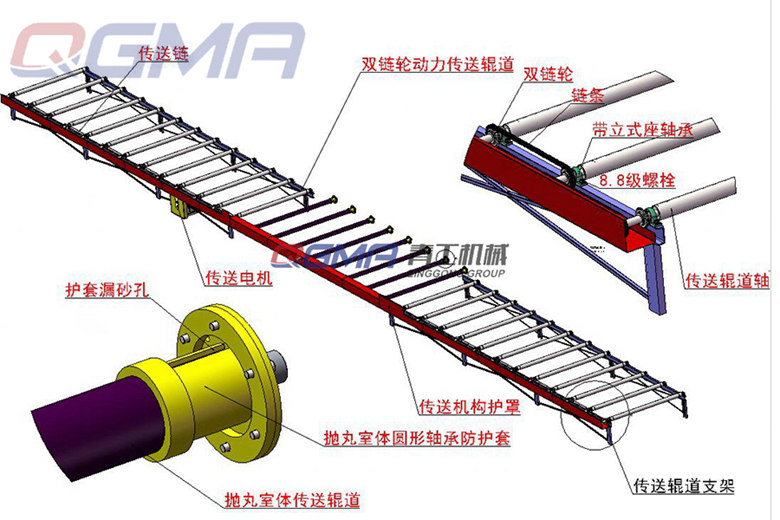 跑步机抛丸机还可适合处理钢板、H型钢、结构件、方管、圆管等应用非常广泛。随着社会的进步和发展在钢铁、造船、钢结构等制造业的所有部门都面临工件清理问题。为了生产高质量部件必须在任何后续处理过程中,保证材料完全无锈、鳞屑及污垢无污染。多种应用效果证明抛丸清理是一种理想的处理方法。跑步机抛丸机采用无级调速高速送进和送出,确保高效率工件完全抛丸清理设备配备光电开关检测达到有工件抛丸无工件不抛丸功能设备采用滚扫+收丸+吹扫两级级清扫弹丸,确保钢板上无弹丸,采用大抛丸量。高抛射速度的抛丸器技术离心式抛丸器,上下抛丸器一对应防止钢板变形弹丸利用率高,显著地提高了清理效率、可以获得满意的清理质量。备有抛丸时间累积计时功能以指导更换地九器叶计片等耐赔件。模拟地射图(包括抛丸器型号、个数和空间布置位置的确定等及抛九机的全部图纸均完全采用计算机辅助设计绘制抛九器的选用及布置更为合理。提高了弹丸的利用率和劳动生产率保证了清理效果减小了对室体护板的磨损。清理室内采用进口防护护板采用特制螺母固定更换简单方便使用寿命较长,是是前抛九清理设备中较好的室体防护板。分离器采用美国公司感应式满蒂帘式分离器技术,分离效果好减少耐磨件磨损。