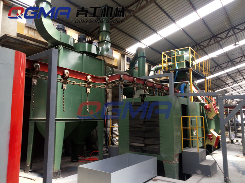 小型锅炉抛丸机的清理室为大容腔板式箱形组焊结构,室体内壁衬有耐磨防护板,清理作业在密封的容腔内进行。输送辊道分为室内输送辊道和装卸料段输送辊道。室内辊道外套高铬耐磨护套及限位环,高铬耐磨护套用于保护辊道,承受弹丸打击,限位环可使工件按预定的位置运行,防止跑偏,造成事故。分离器螺旋输送器主要由减速电机、螺旋体壳组成。采用带方座外球面球轴承,该轴承受到振动冲击时能自动调整,密封性好。输丸管本输丸管道具有双重控丸功能,每一闸管上方均设一闸板,分别切断来自分离器的弹丸,便于维修抛丸机,抛丸器闸板开启大小,可以调节弹丸流量,也可根据清理工件的规格任意组合,开启与关闭闸门数量,以节约能源,减少对机器的磨损,并保证满足生产需要。提升机主要由上、下部传动、筒体、皮带、料斗等组成。提升机上下同径带轮采用筋板、轮板与轮毂组焊成多边形结构,以增强磨擦力,避免打滑现象,延长了皮带使用寿命。提升机罩壳折弯成形,打开提升机中壳上的盖板可维修更换料斗和搭接皮带。打开提升机下壳上的盖板可排除底部弹丸的阻塞。调整提升机上壳两侧螺栓带动拉板上下移动便可保持提升皮带的松紧度。 上下带轮采用带方座外球面球轴承,受到振动冲击时可自动调整,密封性好。抛丸器采用单圆盘抛丸器,成为当今国内完美无缺的高水平抛丸器。它主要由转动机构、叶轮、罩壳、定向套、分丸轮、护板等组成,其中叶轮采用Cr40材质 由锻造而成,叶片、定向套、分丸轮及护板均采用高铬.本装置采用高压风机,并在室体内辅室部分设有不同角度的多组弹性吹嘴,对工件表面余留的弹丸进行吹扫清理。工件进出口密封装置,均采用橡胶弹簧钢板制成,为防止在抛丸时,弹丸飞溅出清理室外,在工件进出口处各设多道加强密封,其特点为弹性强、寿命长、密封效果俱佳。滤筒除尘器或布袋式除尘器主要由除尘器和风机、除尘管道等一起组成除尘系统。除尘效率可达99.5%