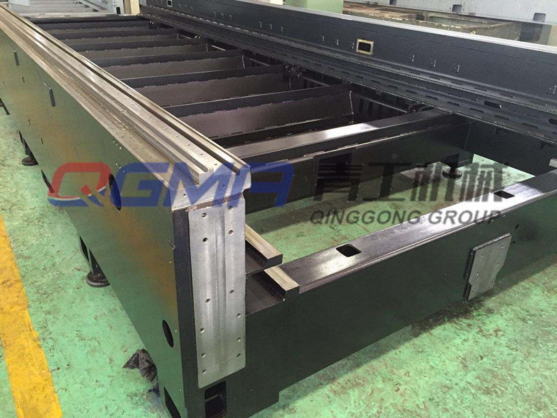 焊接床身好制造,周期短,样式容易调整,成本低,但容易变形,采用抛丸工艺后可大大提高焊接床身的使用寿命. 制造过程:下料(数控火焰切割)→预加工(开坡口)→焊接(二氧化碳气体保护焊)→抛丸机处理→刨→钳→安装复合型导轨→完工