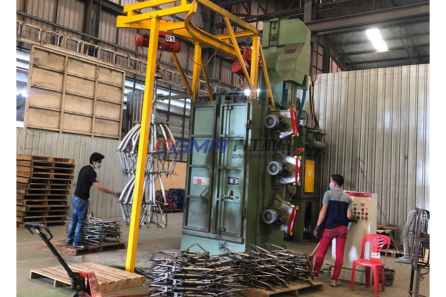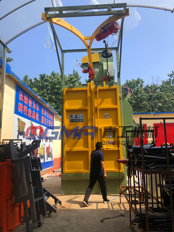 车架抛丸机又叫做车架打砂机,该机器主要作用是清除焊接工件表面的铁锈及氧化皮,为后续的喷漆或喷涂提高表面的附着力,使其工件使用寿命提高5-10倍。工程机械车架抛丸机分为单吊钩和双吊钩,吊钩式抛丸机由两个吊钩装载工件交替进入抛丸清理室内。利用抛丸器将0.1~1.5mm的弹丸抛向工件的表面,使得工件的表面达到一定的粗糙度,让工件变得美观,或者改变工件的压应力提高寿命。轨道一般分为I型、Y型,1-2个高负载吊钩由手动或自动系统控制进入抛丸室进行清理,在多个高效抛丸机和吊钩自转的配合下,可以清理复杂工件的各个表面。