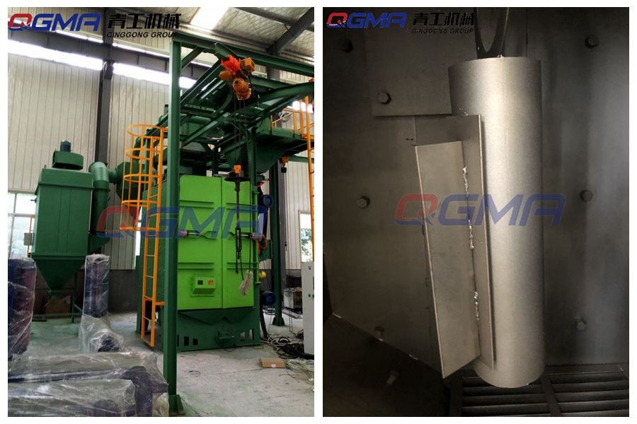 自动: 需抛丸处理的工件直接悬挂在吊钩或挂架上,人工带至抛丸室前部的牵引系统,吊钩自动进入抛丸室。吊钩进入抛丸室后,抛丸室门将气动关闭,电气联锁,以避免工件在抛丸室内进行抛丸处理时他人误开抛丸室门。吊钩进入抛丸室在设定的区间位置作来回往复运动和自转,使工件受到充分抛射,减少抛射死角。二个吊钩、一个吊钩在抛丸室内抛射,另一个吊钩可装卸工件。抛丸处理的时间可任意调整。抛丸器停止运转后抛丸室门打开,以带进和带出工件。抛丸处理中产生的粉尘由二级除尘器过滤排放。