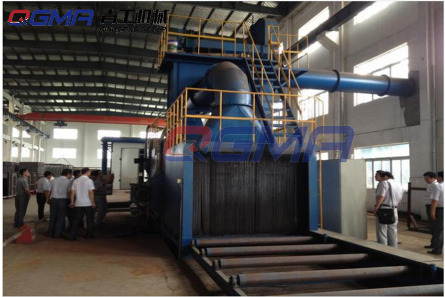 落入钢材上面的弹丸与锈尘经吹扫装置吹扫,撒落下来的丸尘混合物由回收螺旋输送到室体漏斗、纵横向螺旋输送机汇集于提升机下部再提升到机器上部的分离器里,分离后的纯净弹丸落入分离器料斗中内,供抛丸循环使用。卷管表面清理抛丸除锈机抛丸清理中产生尘埃,由抽风管送向除尘系统,净化处理后的净气排放到大气中,颗粒状尘埃被捕捉收集卷管表面清理抛丸除锈机主要用于建筑、桥梁等行业用大型工字型钢、等较高的钢结构件消除应力及表面除锈清理。