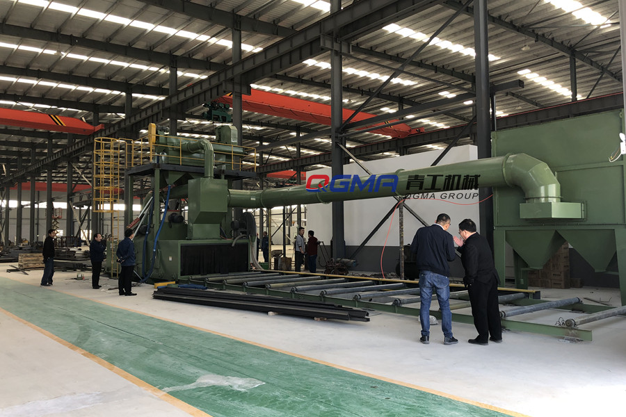 青@工@机@械大型钢板_型材抛丸清理机的抛丸器布置形式为多角度,选用了单元盘叶片高效抛丸器,抛射出高速密集的弹丸束,打击在原始状态钢材的各个部位,进行立体的、全方位的清理,使钢材各表面上的锈蚀层、焊渣、氧化皮及其污物迅速脱落,获得一定粗糙度的光洁表面,提高了漆膜与钢材表面的附着力,并提高钢材的抗疲劳强度和抗腐蚀能力,改善了钢材内在质量,延长其使用寿命。
