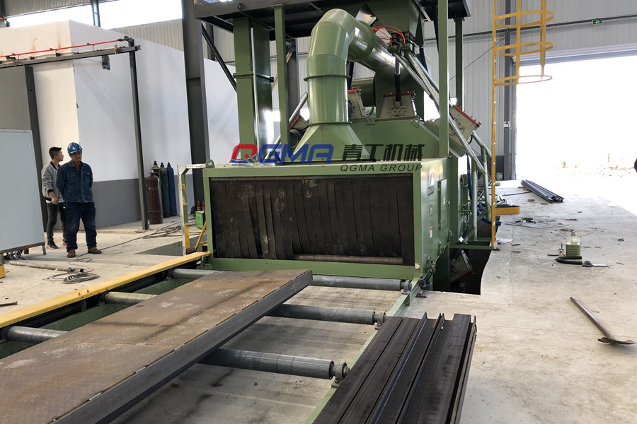 厚钢板通过式抛丸机是通过由电气控制的可以调节速度的输送锟道将钢结构件或者是钢材送到设备的清理机室体内的抛射区,钢材的表面能够受到设备内不同方位的强力的弹丸打击与摩擦,可以将这些钢材表面的氧化皮,锈层以及污渍都处理干净,经过处理之后的钢材表面能够变得更加光洁,经过处理的钢材可以经过清理室外两边进出口的锟道进行卸载。