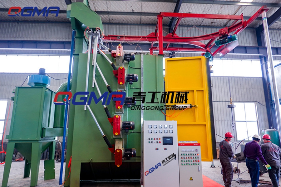 金属制品吊钩式除锈机的在工作时要按照正确的顺序开关机步骤进行:首先要启动金属制品吊钩式除锈机除尘风机,并达到额定转速;然后启动金属制品吊钩式除锈机提升机与螺旋输送电机,将吊有工件的吊钩开进清理室使工件自动旋转,随后关闭室体大门并锁紧,此时与金属制品吊钩式除锈机联锁的行程开关呈通路,允许抛丸器启动,紧接着启动两台抛丸器,并达到额定转速,启动供丸闸门,开始清理作业。等到规定时间,清理完毕,关闭供丸闸门,关闭抛丸器电机,并等待其停转,这时候吊钩停转,提升机与螺旋输送器停转,随后打开大门,吊钩开出室外,检查清理质量,如果合格则卸下工件,如不合格,再返回室体内依上述程序开机再清理一定时间,关闭风机。如果多钩工件需要不断清理作业,则提升机与螺旋输送电机及风机可以不停,其它程序应反复操作,直到全部完成。