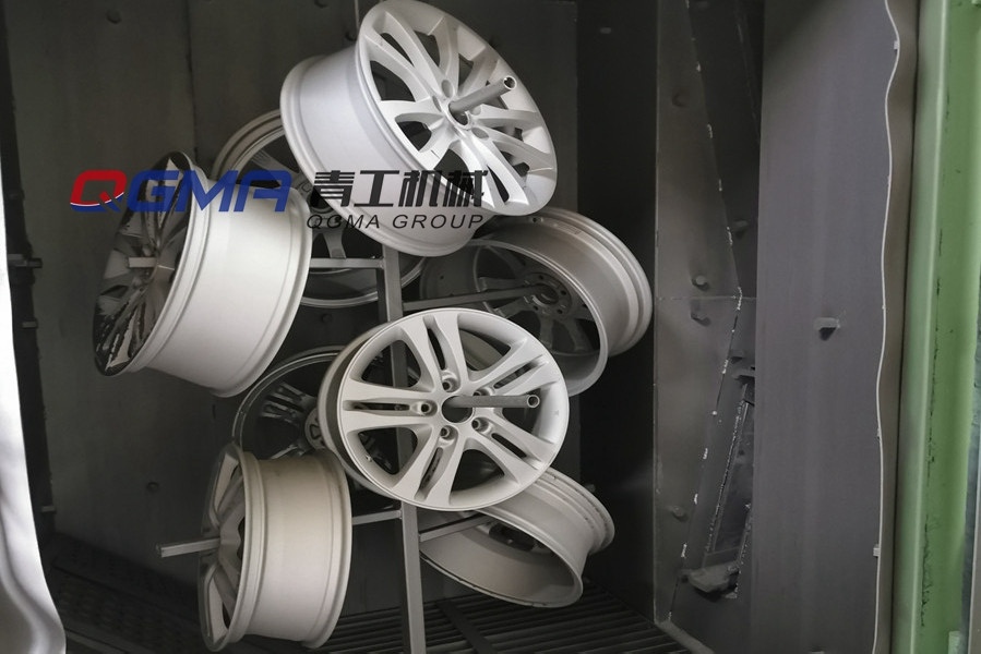 轮毂吊钩式打砂机的清理强化是一个冷处理过程,即通过电动机带动抛丸器运转将无数个小圆形称为钢丸的介质连续击打零件表面。每颗钢丸撞击在金属零件上,宛如一个微型棒捶敲打表面,捶出小压痕或凹陷。为形成凹陷,金属表层必定会产生拉伸。表层下,压缩的晶粒试图将表面恢复到原来形状,从而产生一个高度压缩力作用下的半球,无数凹陷重叠形成均匀的残余压应力层,进一步的提升了工件的表明硬度和抗疲惫强度,得以显著的延长工件的使用寿命。