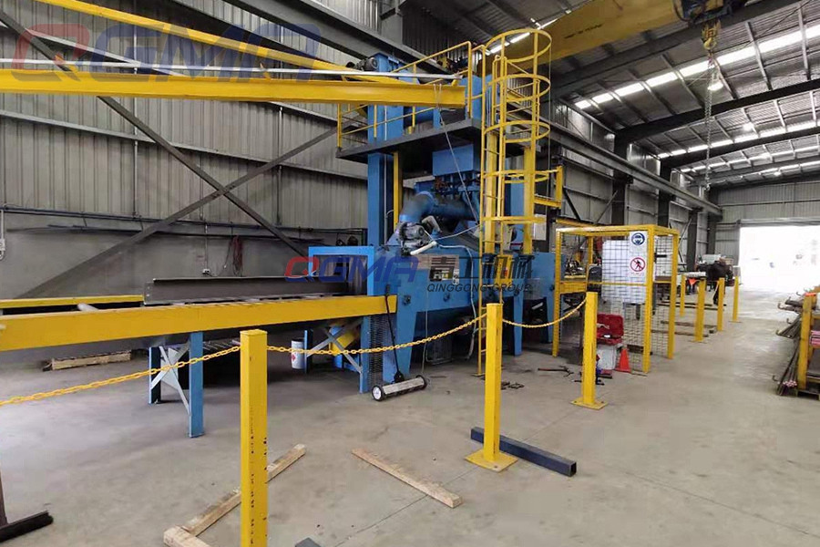德州型材抛丸机采用辊道输送,辊道长度可按客户清理的钢材尺寸定制,将型材吊装在前后转动的辊道之上,通过变频电机带动输送链条,将型材输送至抛丸室内,然后经过上下各四台合计八台抛丸器,从不同角度对钢材表面进行抛丸处理,抛丸强度可通过控制行进速度以及钢丸规格控制,型材抛丸机的自动化程度较高,适合批量生产。
