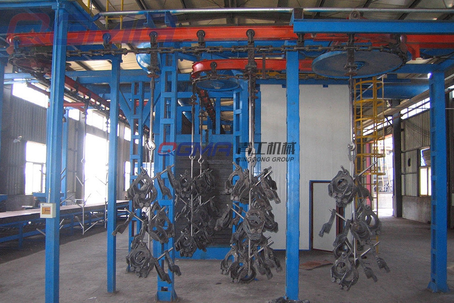 漳州流水线抛丸机的运行模式:工件被吊链输送到抛丸区,根据生产量的大小,可以同时进一钩或两钩,在每个抛丸工位工件分别在三个不同的位置做旋转动作,保证工件可以得到全面的清理。
