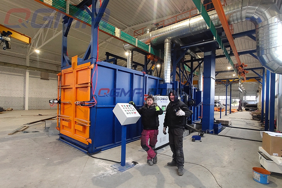 流水线抛丸除锈机是二工位悬链步进式抛丸清理设备,主要由抛丸清理室、气动开关门、抛丸器总成、丸料循环净化系统、悬链输送机(无级调速)、工件自转机构(无级调速)、除尘系统和控制系统等部分组成。悬链式抛丸机的大部分板焊件均经过喷丸处理,提高了防锈性能。