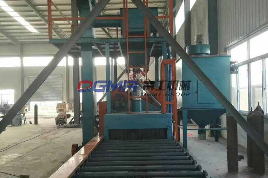 钢板辊道通过式清理机可完成上料、快速运行、变频调速后工进、抛丸清理、变频调速后快出、下料。钢板一般采用钢板辊道通过式清理机来清理,抛丸的目的就是对钢板表面进行连续除磷,钢板表面经过丸料连续打击,使表面氧化铁皮脱落,从而达到一定的表面粗糙度,提高表面喷漆附着力,延长钢板使用寿命。