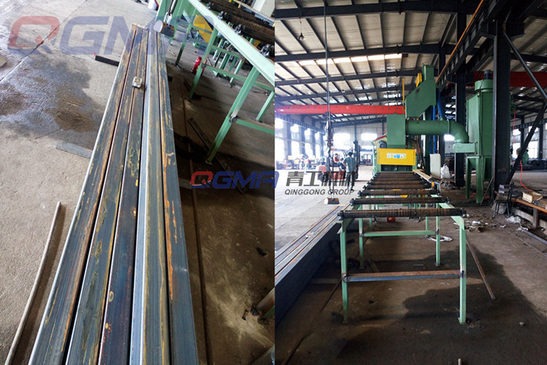 槽钢抛丸机在清理过程中由电气控制的可调速输送辊道将槽钢或型材送进清理机室体内抛射区,其周身各面受到来自不同坐标方位的强力密集弹丸打击与磨擦,使之其上的氧化皮、锈层及其污物迅速脱落,钢材表面就获得一定粗糙度的光洁表面,在清理室外两边进出口辊道装卸工件。落入槽钢、型材上面的弹丸与锈尘经吹扫装置吹扫,撒落下来的丸尘混合物由回收螺旋输送到室体漏斗、纵横向螺旋输送机汇集于提升机下部,再提升到机器上部的分离器里,分离后的纯净弹丸落入分离器料斗中内,供抛丸循环使用。抛丸清理中产生尘埃,由抽风管送向除尘系统,净化处理后的净气排放到大气中,颗粒状尘埃被捕捉收集。