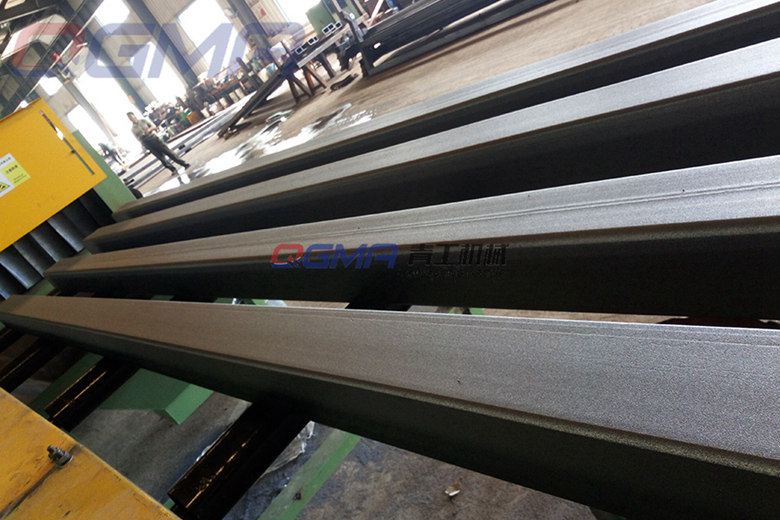 槽钢抛丸机在清理过程中由电气控制的可调速输送辊道将槽钢或型材送进清理机室体内抛射区,其周身各面受到来自不同坐标方位的强力密集弹丸打击与磨擦,使之其上的氧化皮、锈层及其污物迅速脱落,钢材表面就获得一定粗糙度的光洁表面,在清理室外两边进出口辊道装卸工件。落入槽钢、型材上面的弹丸与锈尘经吹扫装置吹扫,撒落下来的丸尘混合物由回收螺旋输送到室体漏斗、纵横向螺旋输送机汇集于提升机下部,再提升到机器上部的分离器里,分离后的纯净弹丸落入分离器料斗中内,供抛丸循环使用。抛丸清理中产生尘埃,由抽风管送向除尘系统,净化处理后的净气排放到大气中,颗粒状尘埃被捕捉收集。