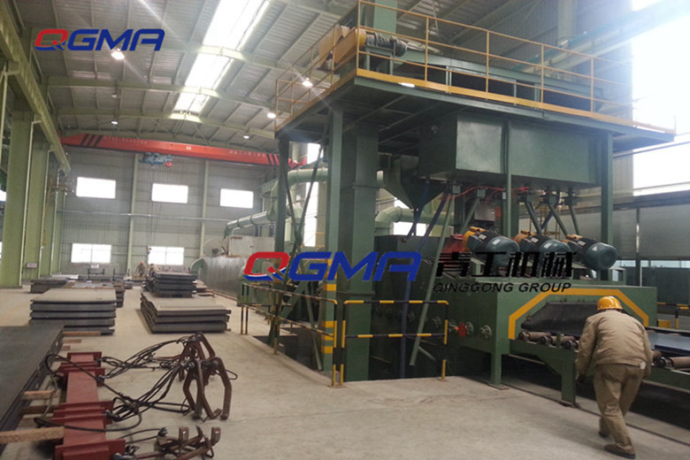 钢板预处理线(喷漆 烘干 抛丸)是生产线由液压上料装置、雨污清扫装置、火焰燃烧预热装置、送进辊道、钢板检测装置、抛丸除锈室、丸料清扫室、中间辊道、喷漆室、烘干室、送出辊道、液压下料装置、抛丸除尘系统、漆雾处理系统及电气控制系统等组成。钢板输送系统由液压上料、送进辊道、抛丸室辊道、中间过渡辊道、烘干室板链输送机、送出辊道、液压下料系统组成。