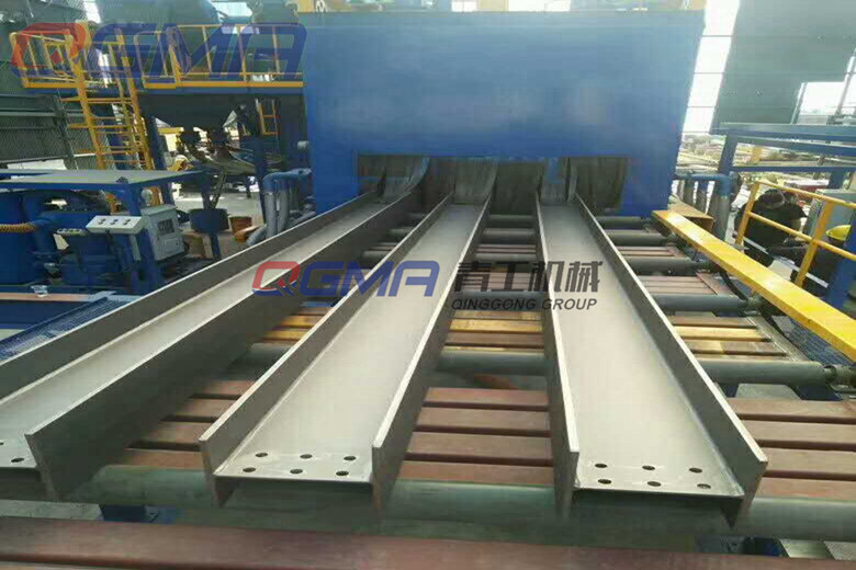 、、、钢(铸铁)制品、、与桥梁制造业,产品可以对原始状态的钢材表面施以强力抛丸,除掉其上的锈层、氧化皮,使之获得均匀一致的金属光泽,以提高钢材的涂饰质量与防腐效果。随着国家对环境污染的惩罚力度的加大,酸洗清理已经逐渐被市场淘汰,钢结构抛丸机会得到越来越多行业领域应用。钢结构抛丸机的室体及的布置方式经计算机动态抛射仿真后确定。采用先进的高抛射速度的直连悬臂离心式抛丸器。抛丸室体采用8mm厚钢板焊接而成箱型结构,强度高而不会产生振动。内部采用护板防护(单班生产寿命2-3年),护板采用衔接,有效的延长了室体的使用寿命,并能充分利用弹丸的反弹形成二次清理。前后密封附室采用8道活页弹簧密封V形装置,可有效的阻止弹丸飞溅,并降低构件对密封的磨损和刮裂,其余密封层采用高密封。为了减少丸料下落过程中对底部料斗的摩擦,在料斗上均含有缓冲。为防止工件上料不正在运行过程中发生跑偏,在两端均做有挡盘。可以根据工件的大小来确定的开启数量,这样可以减少不必要的能量浪费,同时减少对设备不必要的破环。供丸系统采用特殊的气控供丸和工件光电检测,防止弹丸空抛。我公司采用的闸阀为小巧轻便型无底座、耳座的气缸,较传统的有座气缸更为稳定、可靠,且维修方便快捷。除尘系统采用三级+旋风体+,除尘效果极佳。由于工件采用工装输送,辊道输送驱动系统采用双向传动。防逆转采用双保险设计:一是传动头轮采用棘轮棘爪机构防止逆转,二是传动电机采用防逆转。同时在被动轮处设有丢转检测报警装置。分离器满幕帘流幕设计:变螺距分离器采用双加控制,根据弹丸情况自动调节流幕,达到满幕帘流幕的效果。该技术为我公司独有。弹丸自动补充装置:清理室顶部料仓内设有上下料位计,自动检测弹丸量。提升机下部设有补丸斗及气动闸门,与上部料仓内的料位计联合控制补丸,补丸斗中设有料位计,进行加丸报警。除尘系统采用脉冲反吹垂直滤筒式,比传统的布袋式以及传统的斜插式效果更强,垂直式布置更换滤筒更为方便快捷(打开检修门即可),克服了斜插式布置维修困难和上层滤筒的灰尘落到下层滤筒导致除尘效果不理想的弊端。