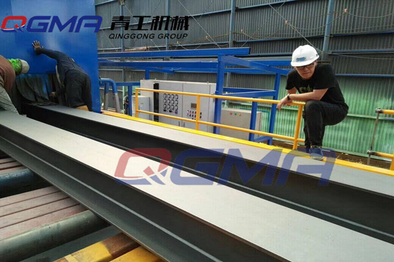 分为室内输送辊道和装卸料段输送辊道。 室内辊道外套高铬耐磨护套及限位环,高铬耐磨护套用于保护辊道,承受弹丸打击,限位环可使工件按预定的位置运行,防止跑偏,造成事故。