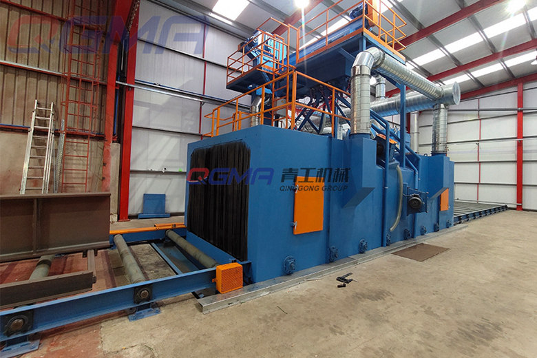 由输送辊道送至封闭的抛丸清理室,,利用抛丸器高速旋转的叶轮用(弹丸)加速抛射至工件表面,对工件表面进行冲击、刮削以清除工件表面的铁锈和污物,然后利用横扫、滚刷、收丸螺旋和高压吹管将工件表面的积丸和浮尘吹扫干净,(此为型材,只有处理才用到横扫、滚刷、收丸和高压吹管,虽然钢结构抛丸机有的也用的高压吹管吹工件表面的积丸但效果不理想,客户用了不长时间就自行拆除了)由送出辊道送出,从而使达到除锈、防锈的目的