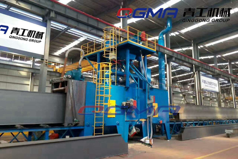 型材抛丸机在清理过程中由电气控制的可调速输送辊道将槽钢或型材送进清理机室体内抛射区,其周身各面受到来自不同坐标方位的强力密集弹丸打击与磨擦,使之其上的氧化皮、锈层及其污物迅速脱落,钢材表面就获得一定粗糙度的光洁表面,在清理室外两边进出口辊道装卸工件。落入槽钢、型材上面的弹丸与锈尘经吹扫装置吹扫,撒落下来的丸尘混合物由回收螺旋输送到室体漏斗、纵横向螺旋输送机汇集于提升机下部,再提升到机器上部的分离器里,分离后的纯净弹丸落入分离器料斗中内,供抛丸循环使用。抛丸清理中产生尘埃,由抽风管送向除尘系统,净化处理后的净气排放到大气中,颗粒状尘埃被捕捉收集。