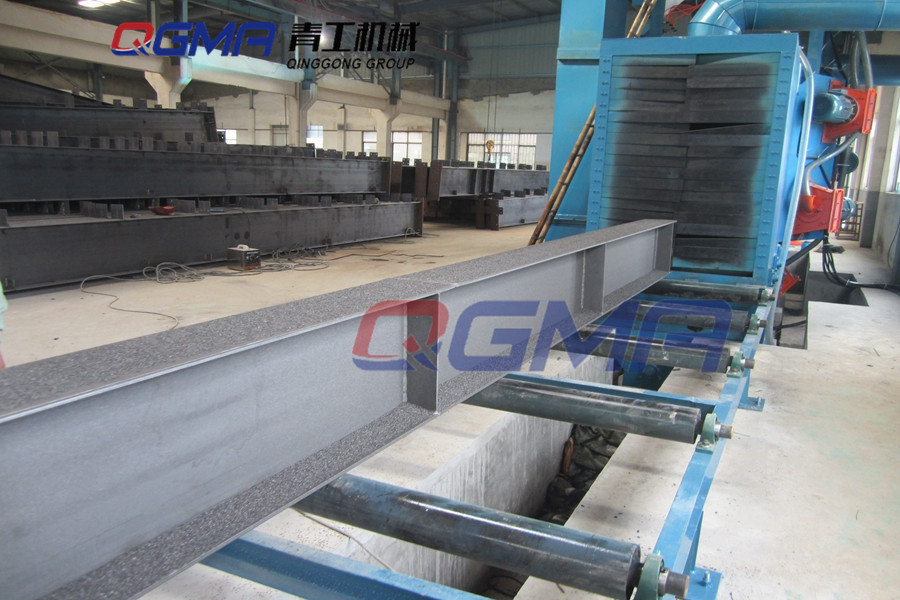 型钢抛丸机,型钢专用抛丸机清理过程中由电气控制的可调速输送辊道将槽钢或型材送进清理机室体内抛射区,其周身各面受到来自不同坐标方位的强力密集弹丸打击与磨擦,使之其上的氧化皮、锈层及其污物迅速脱落,钢材表面就获得一定粗糙度的光洁表面,在清理室外两边进出口辊道装卸工件。落入槽钢、型材上面的弹丸与锈尘经吹扫装置吹扫,撒落下来的丸尘混合物由回收螺旋输送到室体漏斗、纵横向螺旋输送机汇集于提升机下部,再提升到机器上部的分离器里,分离后的纯净弹丸落入分离器料斗中内,供抛丸循环使用。抛丸清理中产生尘埃,由抽风管送向除尘系统,净化处理后的净气排放到大气中,颗粒状尘埃被捕捉收集。