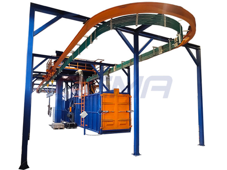 意昂注册吊钩式抛丸机分为单吊钩和双吊钩,吊钩式抛丸机由两个吊钩装载工件交替进入抛丸清理室内。利用抛丸器将0.1~1.5mm的弹丸抛向工件的表面,使得工件的表面达到一定的粗糙度,让工件变得美观,或者改变工件的压应力提高寿命。轨道一般分为I型、Y型,1-2个高负载吊钩由手动或自动系统控制进入抛丸室进行清理,在多个高效抛丸机和吊钩自转的配合下,可以清理复杂工件的各个表面。