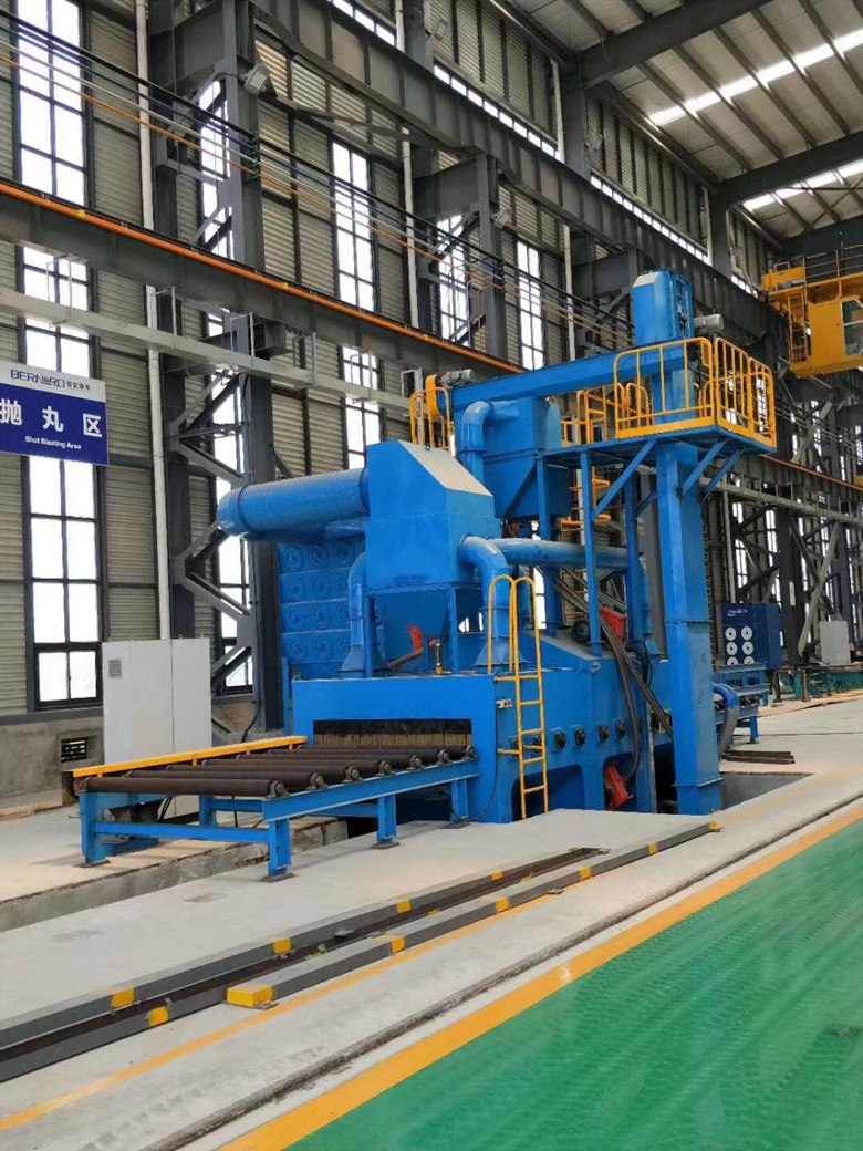 落入钢材上面的弹丸与锈尘经吹扫装置吹扫,撒落下来的丸尘混合物由回收螺旋输送到室体漏斗、纵横向螺旋输送机汇集于提升机下部再提升到机器上部的分离器里,分离后的纯净弹丸落入分离器料斗中内,供抛丸循环使用。辊道通过式抛丸机抛丸清理中产生尘埃,由抽风管送向除尘系统,净化处理后的净气排放到大气中,颗粒状尘埃被捕捉收集辊道通过式抛丸机主要用于建筑、桥梁等行业用大型工字型钢、等较高的钢结构件消除应力及表面除锈清理。